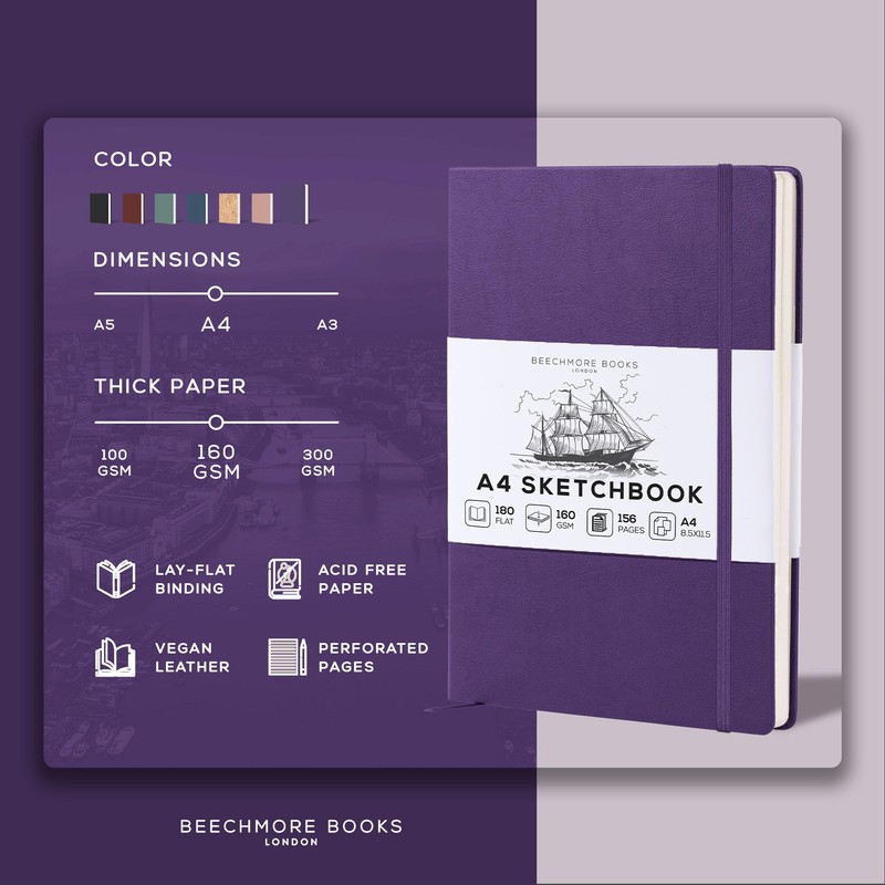 BEECHMORE BOOKS Sketch Book, A4 8.5 x 11.5 inch Blank Sketchbook for Drawing, Paint and Draw, 156 Pages Thick Paper 160gsm, Hardcover Leather Art Notebook, Boxed for Gifts (Royal Plum)