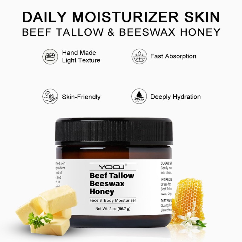 - Beef Tallow, Beeswax and honey promote skin hydration, lock in moisture, tighten the skin, and make the skin plump and elastic