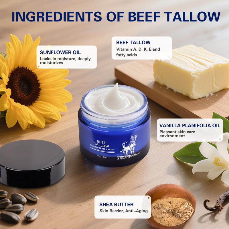 - Pleasant Sensory Experience: Rich in fatty acids, vitamins A, D, E, and K2, Three natural plant oils work synergistically with tallow butter to form a complete care program from instant moisturizing to long-term Care, saying goodbye to the heavy feeling of traditional animal fat creams and turning the process of strong moisturizing into a sensory enjoyment.