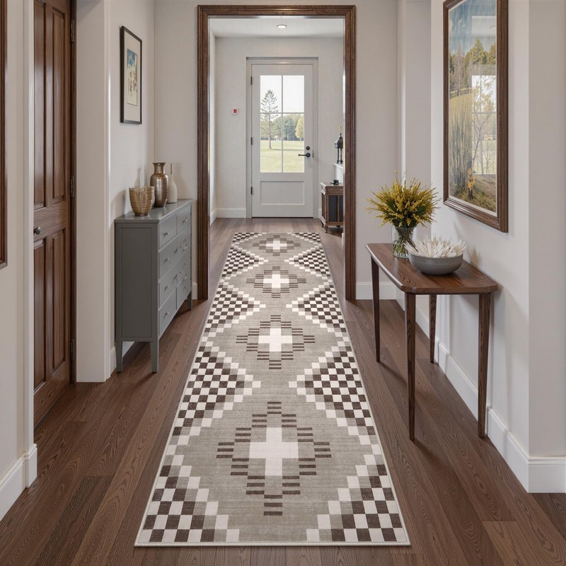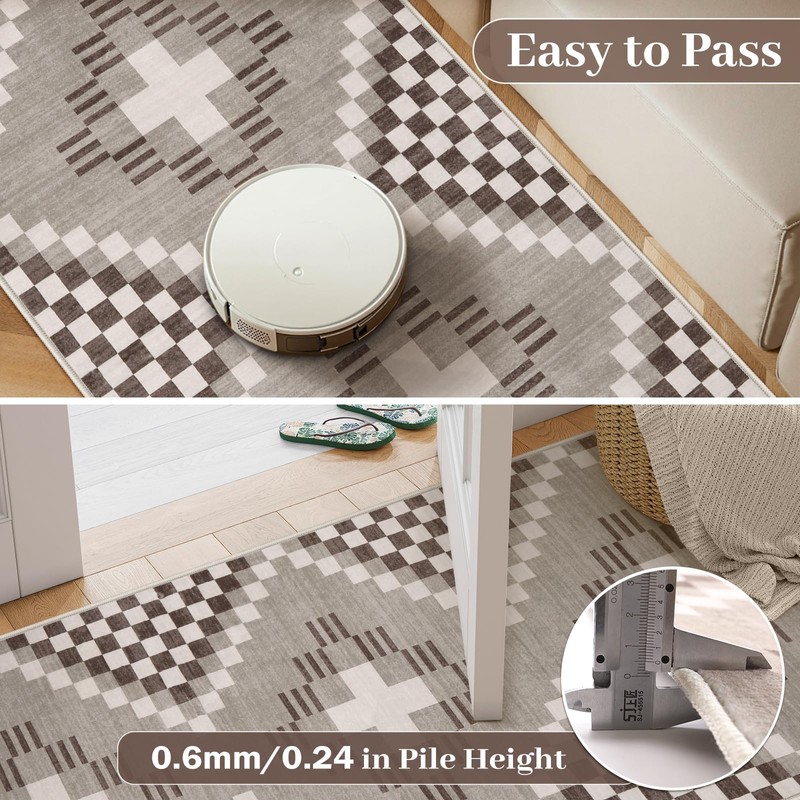 - BOHO CHECKERED RUNNER RUG: With checkered elements as the core, the distressed and faded checkerboard design, paired with khaki and natural tones, retains the geometric farmhouse beauty and adds a unique visual focus to the home environment