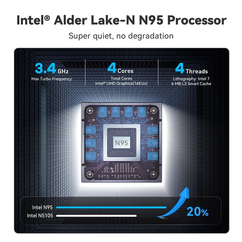 CPU:Intel Processor Alder Lake-N95(4C/4T,up to 3.4GHz 6 MB Smart Cache)