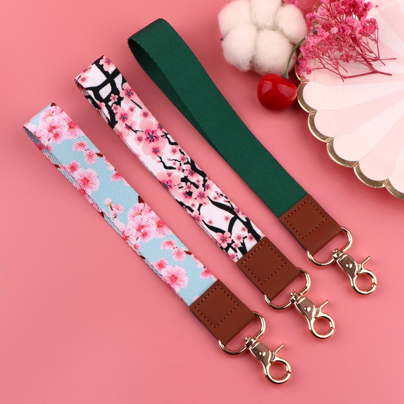 beemorita Cute Wrist Lanyard for Keys ID Badge, Wallet for Women Girls Pink Keychain Wristlet Boho Cell Phone Wrist Key Chain Strap with Keyring & Phone Pad(Cherry Blossom Flower)