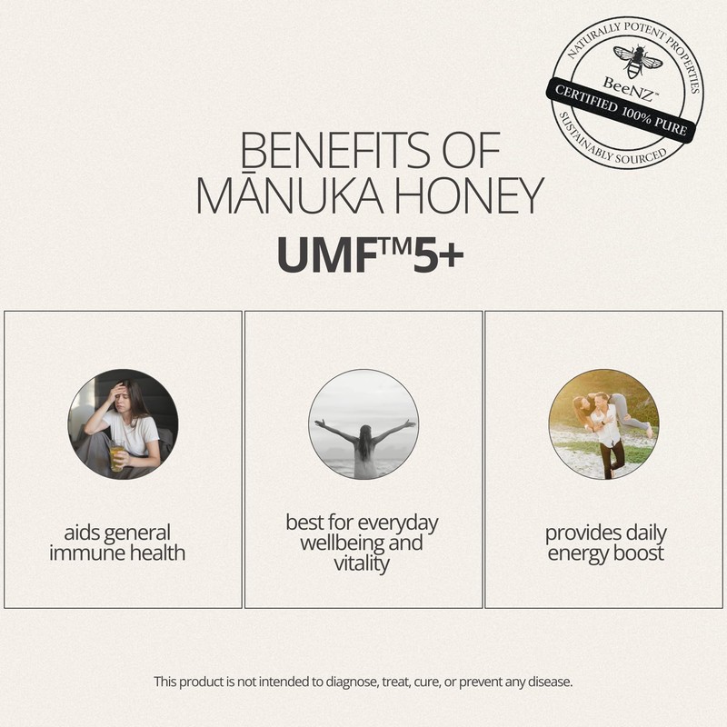 - MANUKA HONEY UMF 5+: BeeNZ's UMF5+ Manuka Honey is our go-to for supporting everyday wellness. It contains a great entry-level of unique properties that make Manuka Honey so special, and it tastes wonderful; earthy and sweet, but tempered with complexity. Add to smoothies, baking, granola, a slice of toast... or just enjoy a spoonful straight to the mouth; treat yourself.
