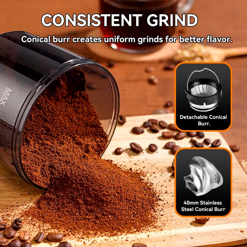 - [ Improved Conical Burrs Design ] 40mm stainless steel conical burrs design can grind coffee beans quickly, quietly and evenly, while keeping the grinding temperature below 107℉ to better retain the best flavor of coffee.
