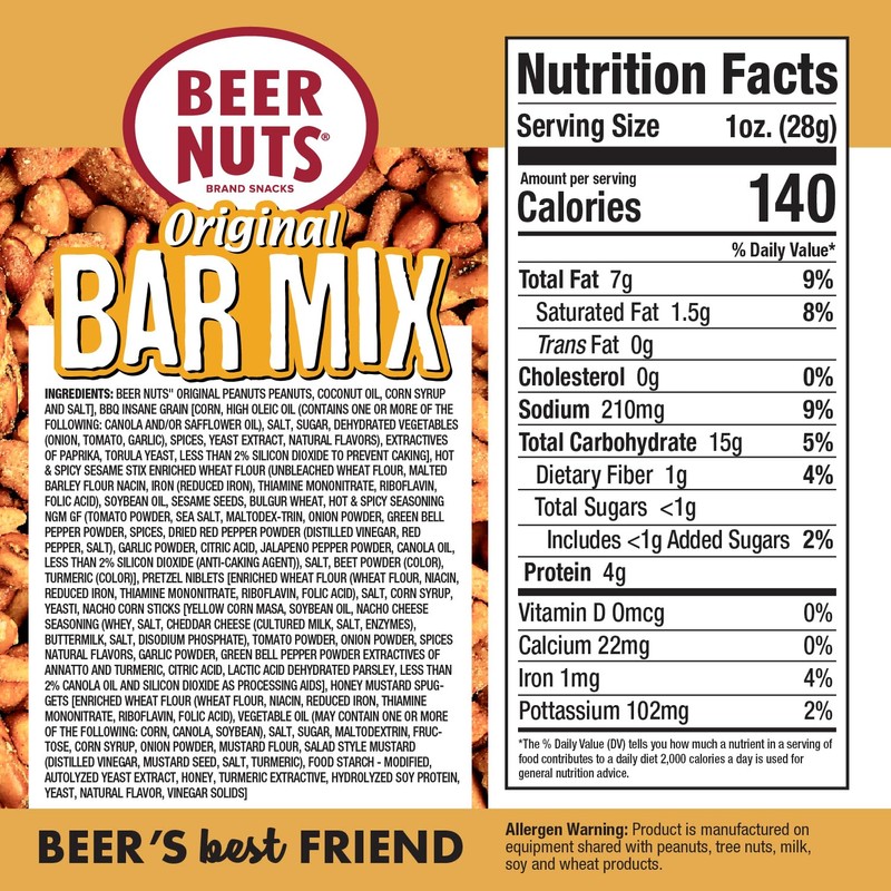- DELICIOUS FLAVORS – The BEER NUTS Original Bar Mix features a sweet and salty mix of BEER NUTS original peanuts, BBQ insane grain, hot & spicy sesame stix, pretzel nublets, nacho corn sticks, and honey mustard spuggets