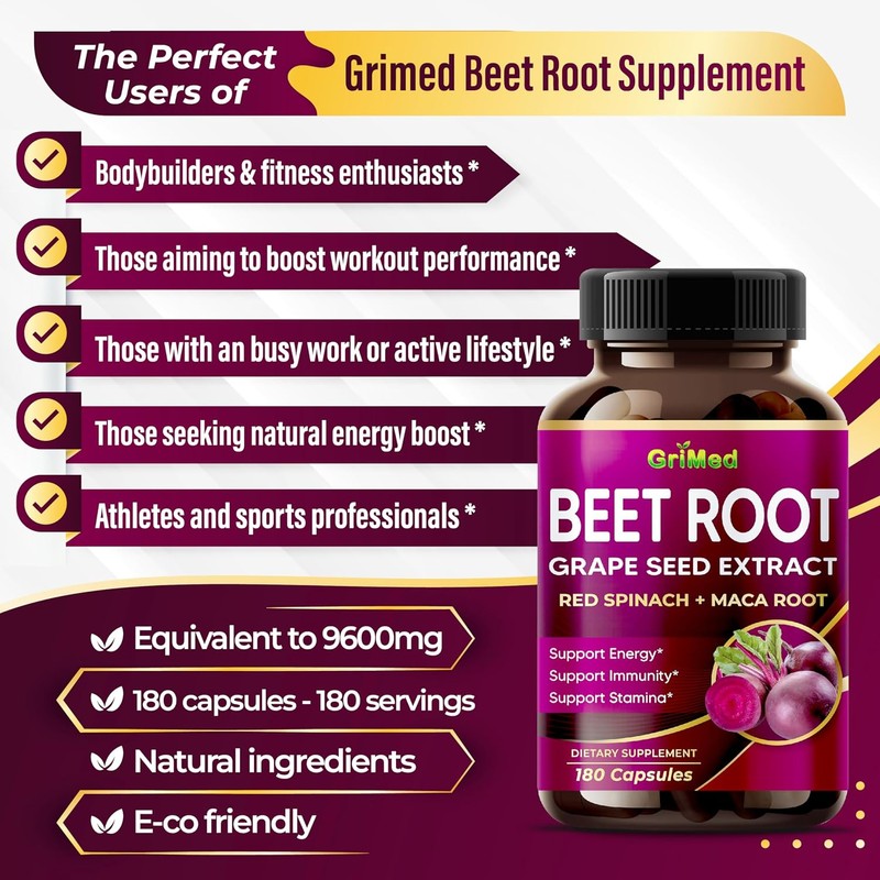 Beet Root Supplement 12,900mg x12 Potency with Grape Seed Extract, Maca Root, Red Spinach & Ashwagandha – Heart Support & Healthy Energy Supplement – 180 Capsules (1 Pack)