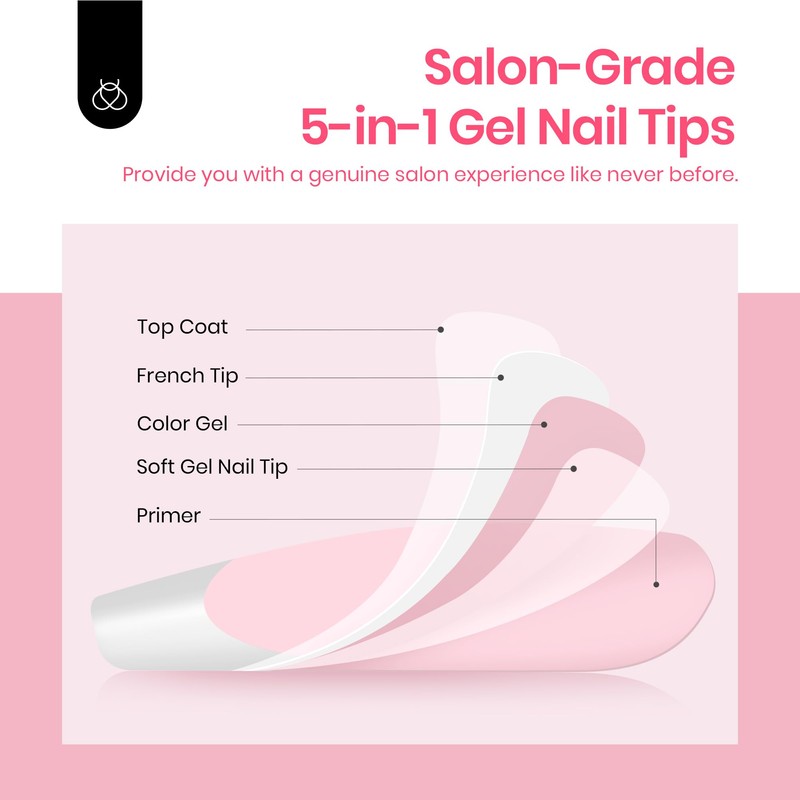 - 【Upgrade 5-In-1 Press On Nails】Beetles 5-in-1 pink french tip short square press on nails are made with primer, soft gel nail tips, color gel, french tip and top coat. Top coat provide ultra-protection for french tips, and we thickening the front edge of the new french tips press on nails, which is tough and not easy to break. With proper use, it can be maintained for 28+days