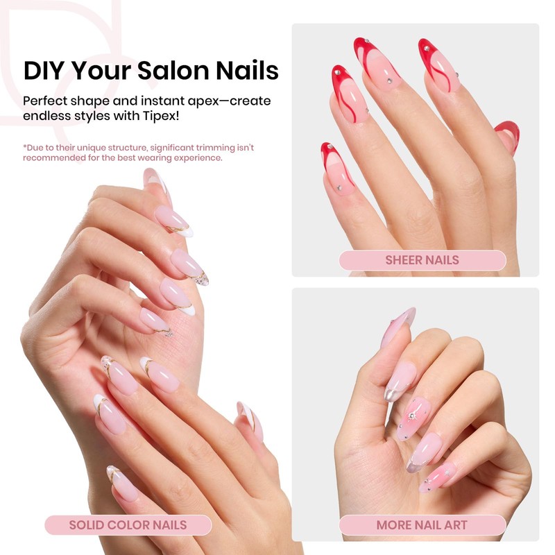 - WARM TIPSTipex tips have a thicker, structured shape. Use with solid nail glue. Not ideal for beginners or those who prefer soft, thin tips.