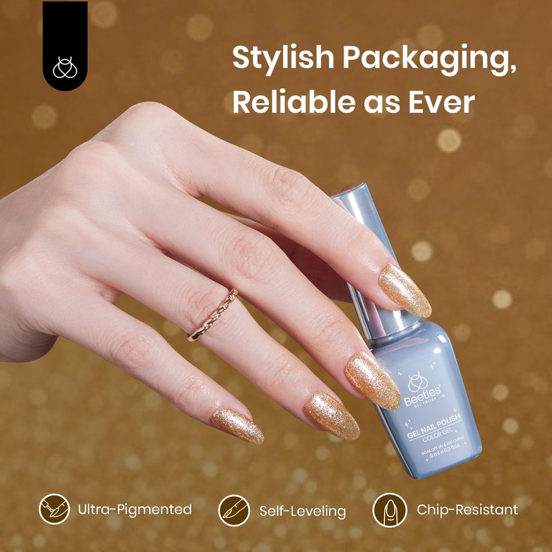 Beetles Glitter Gel Nail Polish 9ml: Gold Shimmer Sparkly Gel Polish Long-Lasting Soak Off U V LED Shiny Champagne Rose Gold Gel Polish Salon-quality, Gift for Women Girls