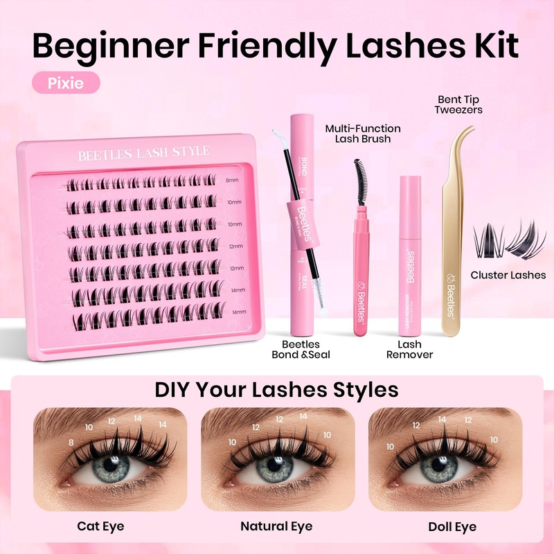 Beetles Lash Kit Fairy Lash Clusters Manga Eyelash Extension Kit 70 Pcs CC Curl 8-14mm Individual False Eyelashes Clusters with 2-in-1 Bond and Seal Remover Brush Tweezers DIY at Home Pixie KMP079