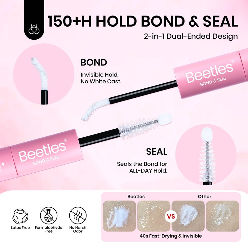 - Adhesive and Removal: 150+ hours Long Lasting 2-in-1 Dual Effect BOND & SEAL, perfect for commuters or all-day wear—even while sleeping. The formula dries clear and traceless, ensuring an invisible finish. Safe - no latex, or harsh odors, also ideal for sensitive eyes. Effortless Removal: Dissolves adhesive easily but gentle on natural lashes. Contains Vitamin E, keeps natural lashes soft and healthy.