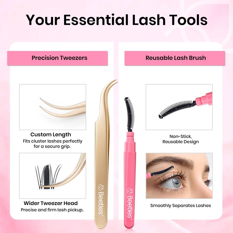 - Tips: Application steps please refer to the instructions on the packaging. Wear different length clusters can achieve different looks. Usage of multipurpose Lash Brush: 1. Pre-lash Combing: Prevents natural lashes from clumping. 2. After Eyelash Clusters Application/Mascara: Shapes and adjusts cluster eyelash extensions. 3. Eyebrow Grooming: Tames and shapes eyebrows。