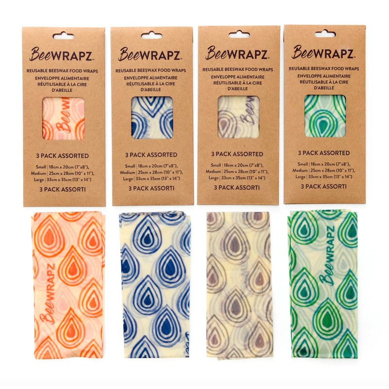 BeeWRAPZ Pack of 3 prevents food from spoiling with a unique blend of beeswax, organic jojoba oil, and tree resin. They keep food fresh for up to 1 year, are biodegradable, and plastic-free. These reusable wraps are perfect for storing, transporting, and preserving food. Available in four colours. Each pack contains 3 wraps: 1 Small - 18cmx20cm(7" x 8") 1 Medium - 25cmx28cm(10"x11") and 1 Large - 33cmx35cm(13" x 14") Self Sealing: Wrap around food or cover any dish. Self seals with the warmth of your hands. Easy to clean: Wash or wipe in COLD water with a cloth and eco-friendly dish soap if required. Reusable: Lasts a year or longer with good care. At the end of its life cycle, product is fully biodegradable. Compost or use as fire starters to help ignite your fire. Plastic Free: Eliminate single use plastic wrap in your kitchen with BeeWRAPZ, a more sustainable option.