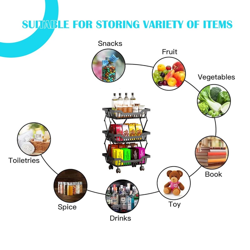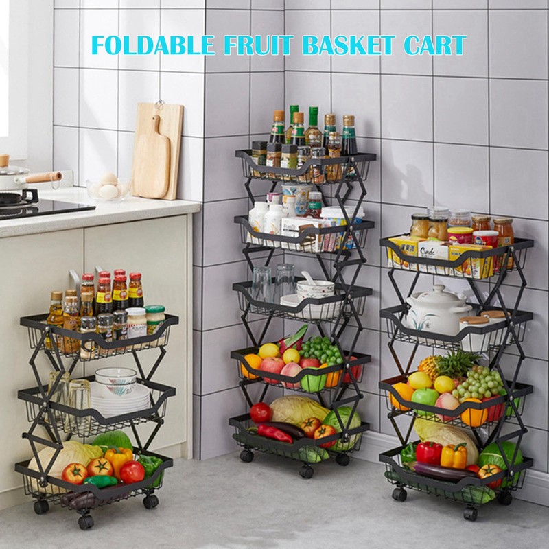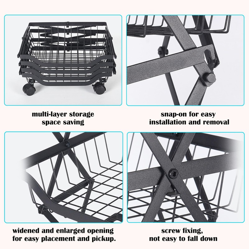 - FOLDABLE KITCHEN STORAGE BASKET: It uses clasps to stack each layer of fruit baskets together; it is simple and easy to install, and you don't need cumbersome assembly tools to complete it. When the kitchen storage basket is unfolded, you can see that its support frame is a solid triangular design. When you don't need it, you can fold it up and put it in an organizer or corner without taking up too much space.