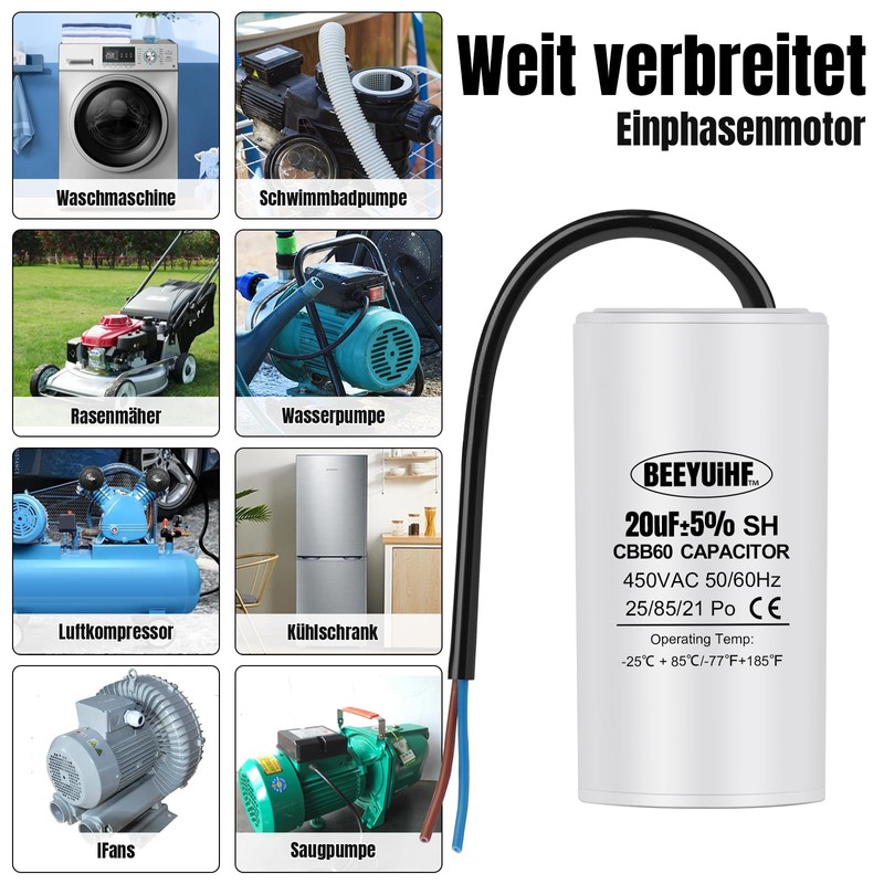 BEEYUIHF CBB60 450V Motor Capacitor, 50/60Hz Capacitors, Starting Capacitor with Cable, 450V Motor Capacitors for Electric Motor / Tumble Dryer / Washing Machine.
