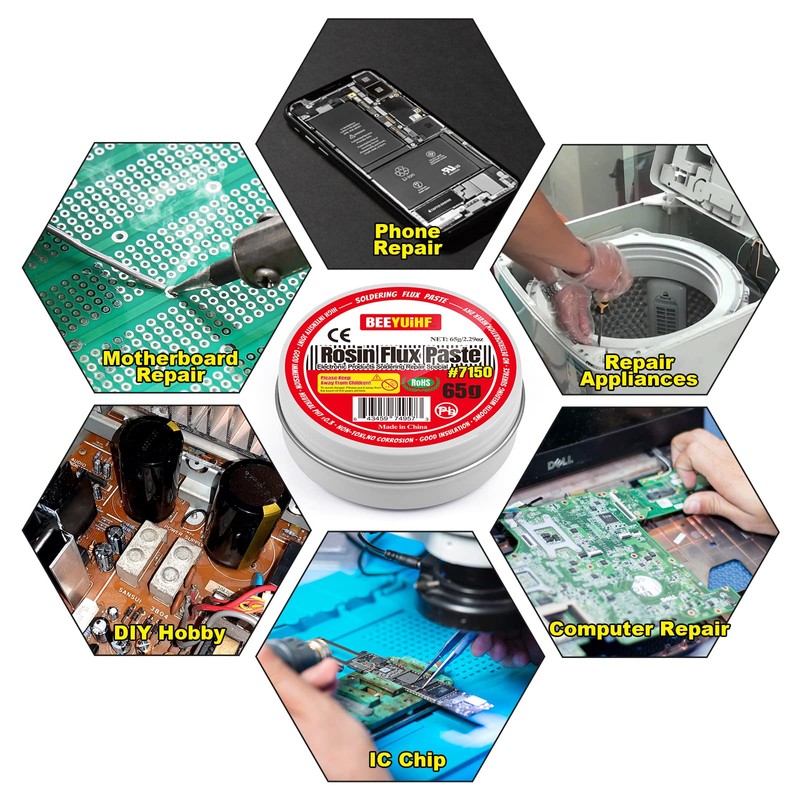 - BEEYUIHF #7150 Soldering Paste gross weight:(2.29oz/65g); Net weight:(1.76oz/50g)Rosin Solder Paste Flux, made of no acid, Lead-Free, No-Clean, soldering flux paste which is not easy to dump. Rosin Soldering Paste,High Purity,Good helper for repairing and welding.
