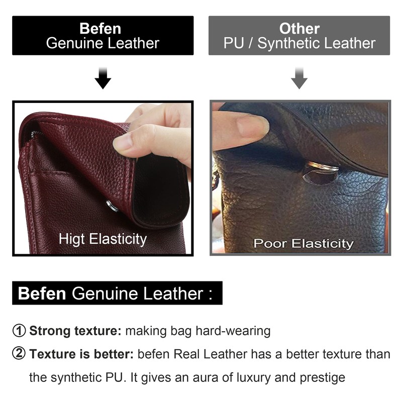 - đăVALUE FOR MONEY - GENUINE LEATHER PHONE BAGă: Befen Phone bag is made of ăSoft GENUINE Leatheră and is crafted in ănatural pattern yak leatheră, fabric lining,ăSilveră tone metal hardware.The crossbody phone bag hasăDetachable Long Strapă, which has more strong texture and Softness than other shopâs PU Leather.