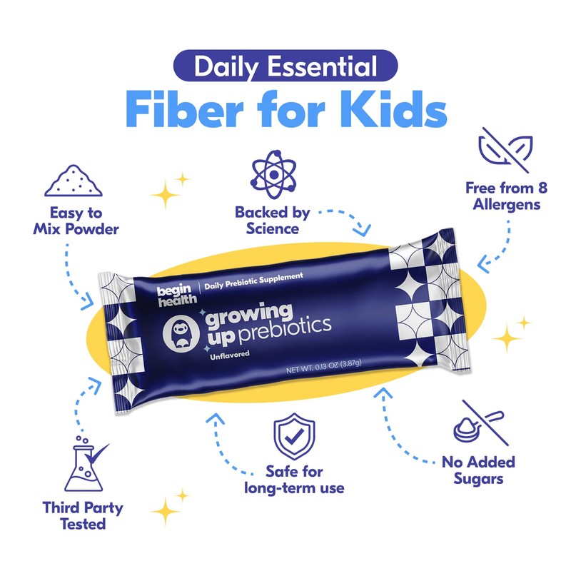 Begin Health Growing Up Prebiotics for Kids 28-Packs | Prebiotic Soluble Powder Stool Softeners and Digestive Gut Health Supplement | Ideal to Mix with Kids Daily Beverages and Soft Foods - Unflavored
