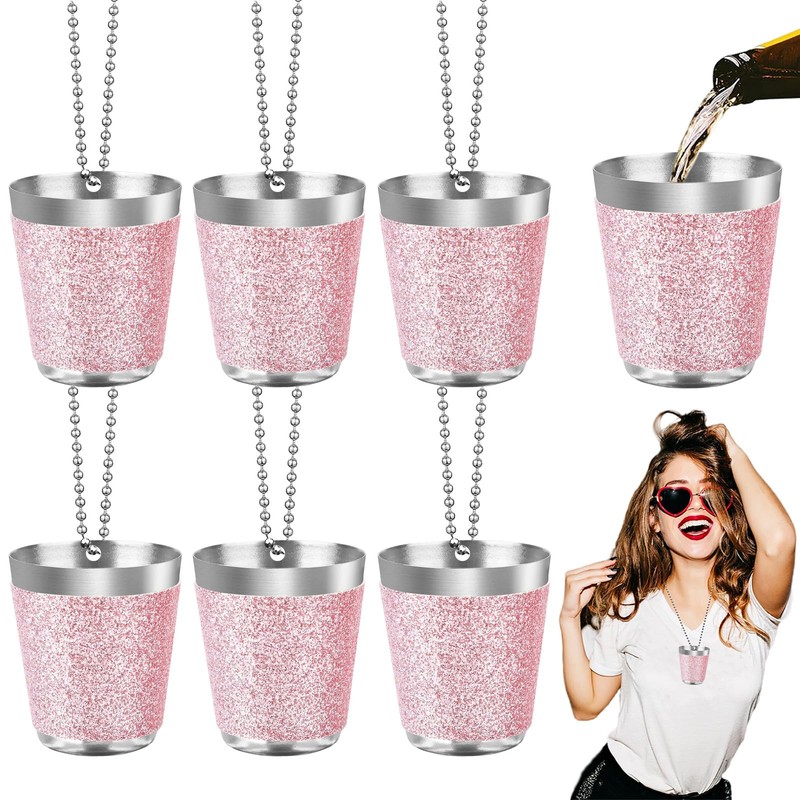 Begpoee Pack of 6 Shot Glasses Stainless Steel 30 ml, Shot Cups Metal for Hanging, Shot Cups with Chain, for Wedding Parties, Carnival, Birthday Party, Bachelorette Party (4.2 x 3.7 cm, Pink + Silver)