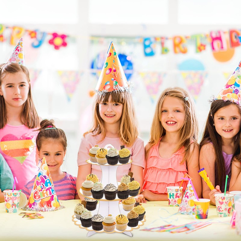 - Package Includes: 2 pack sturdy cardboard cupcake towers are constructed with a sturdy central stand and 3 round single-sided colorful discs.