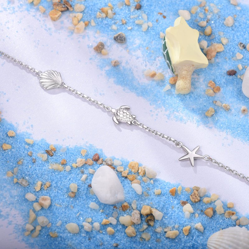 BEILIN 925 Sterling Silver Ocean Beach Anklets for Women Starfish Conch Turtle Ankle Bracelets for Women