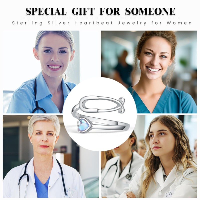 BEILIN Stethoscope Rings for Women 925 Sterling Silver Adjustable Heart Moonstone Ring Nurse Doctor Jewelry Graduation Gifts for Medical Student (Moonstone)