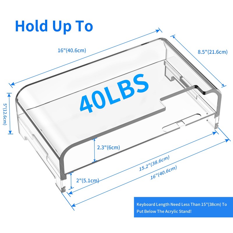 - 4.【Suitable Dimension and Heavy-Duty】- This acrylic laptop stand size is 16" x 8.5" x 5", the thickness is 0.4", under combination for this length and thickness, you will never see any sagging or bending, holds up to 40 lb and fits any monitors and screens, up to 30". This acrylic monitor stand is long enough to hold most types of keyboards below it (keyboard length need less than 15").
