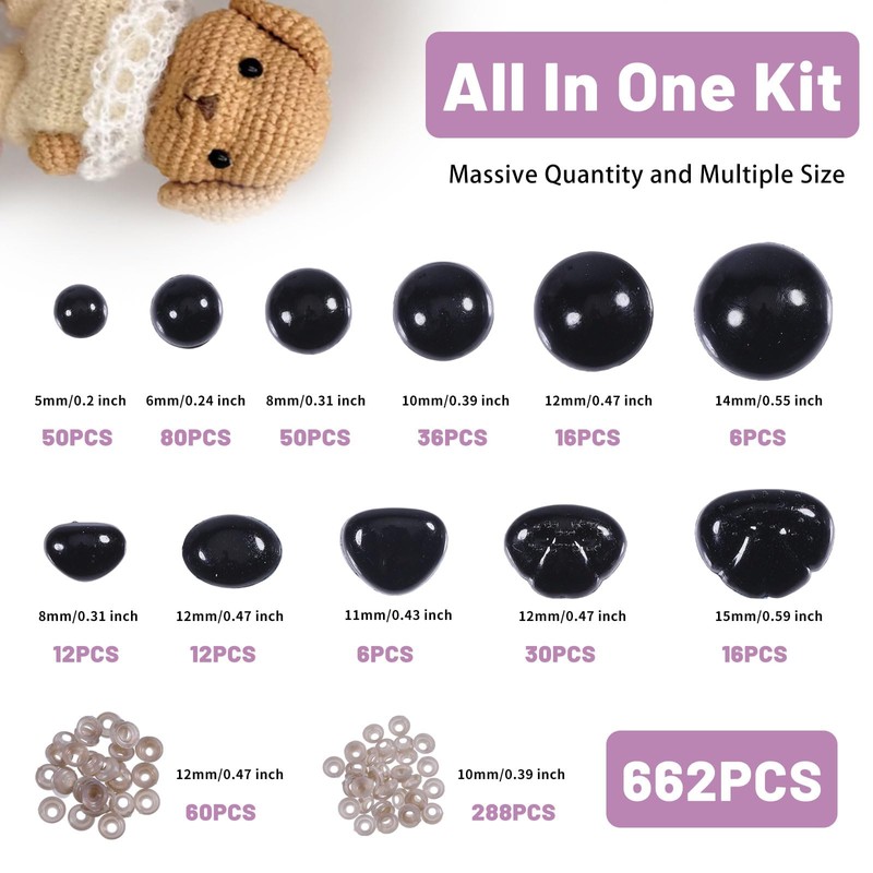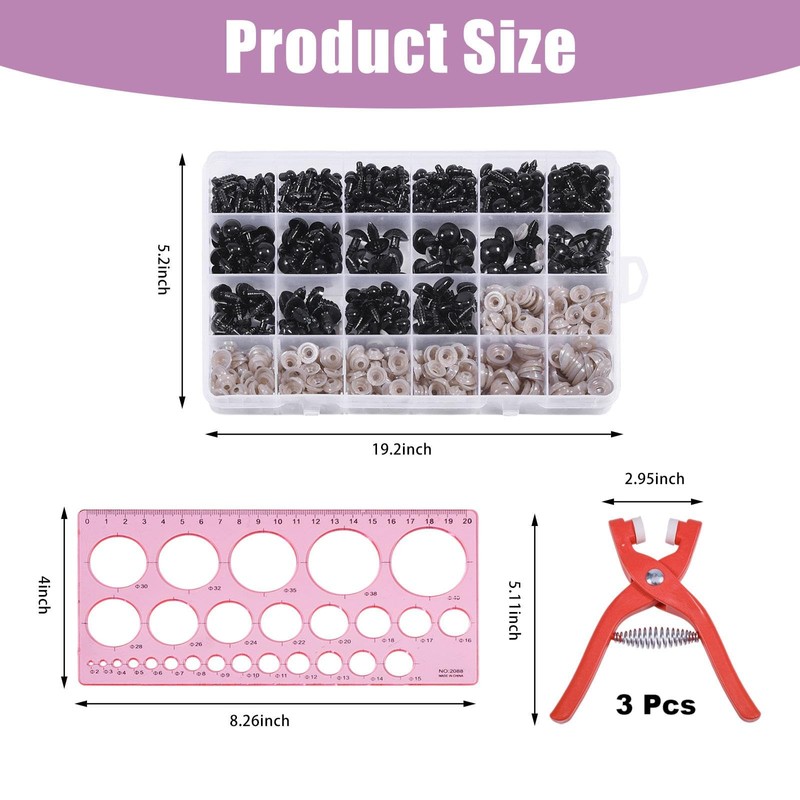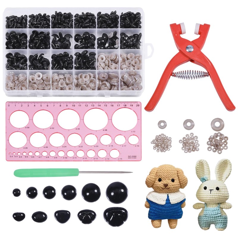- Complete Safety Eye Kit: 3Pcs safety eye tool auxiliary Tool 2.95 x 5.11 In, 662Pcs safety eyes and noses in various sizes, 1 ergonomic auxiliary installation tool 2-40mm size measurement tool