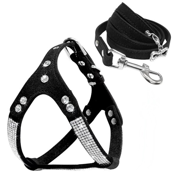 Beirui Soft Cat Harness - Rhinestone Leather Dog Harness Leash Set Cat Puppy Sparkly Crystal Vest & 4 ft Lead for Small Medium Cats Pets Chihuahua Poodle Shih Tzu,Black,Large Chest for 21-23.5"