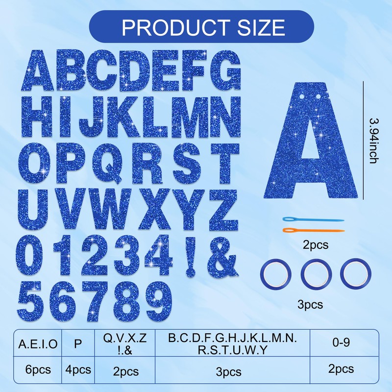 PACKAGE INCLUDES:There are a total of 111 letters and numbers, 3 ropes, and 2 threading devices.Detailed number of letters and numbers: 6pcs of the letters 'A,E,I,O', 4pcs of the letters 'P', 2pcs of the letters 'Q,V,X,Z,! &',3pcs of the letters 'B,C,D,F,G,H,J,K,L,M,N,R,S,T,U,W,Y', and the numbers 0-9 are 2pcs each. Each letter is 3.94 inch