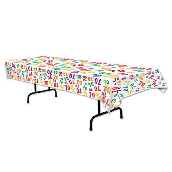 The "70" Tablecover is a white plastic tablecover with an all-over print of the number 70 in assorted colors. It fits a rectangular table and measures 54 Inch wide by 108 Inch long. Use for a 70th birthday party!.