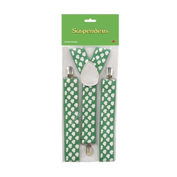 Beistle 30804 Shamrock Suspenders. Have a little fun and add some shamrock suspenders to your St. Patrick's Day wardrobe! The suspenders are green with white shamrocks. They are adjustable are one size fits most.