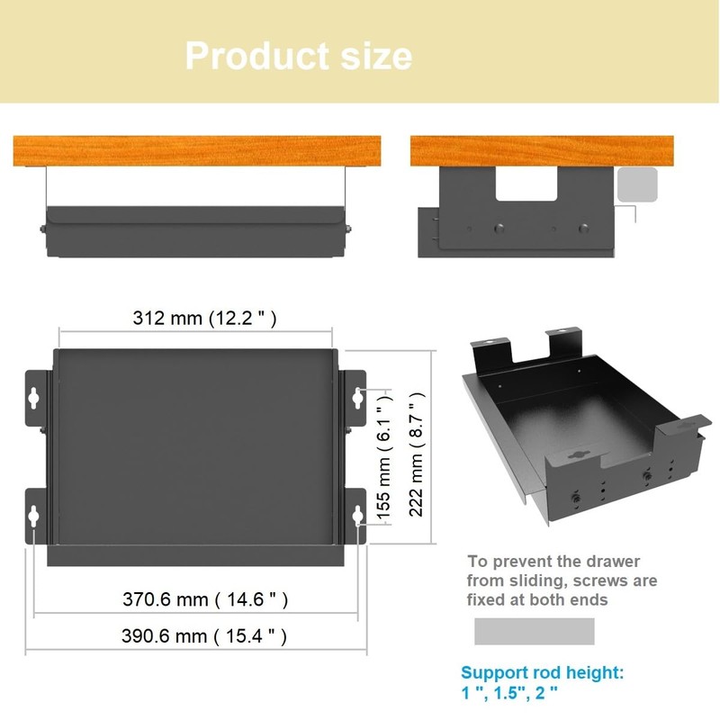 - Higher Storage Space: Besides desk or table with flat desktop, this drawer is also suitable for desktops with 1",1.5" or 2" support bar. You can install the drawer at a higher storage space and avoid the support bar well. Also the storage space increases half.