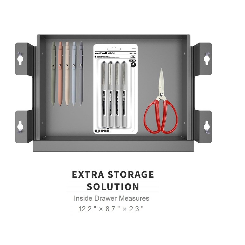 - Assembled Drawer Size: 13.4"W x 9.8"D, Ajustable Height from 3.66" to 4.64", the inside storage space: 12.2" W x 8.7" D x 2.3" H, enough space for pencils, paper, office supplies, standing desk accessories under desk, table or workstation in office, home office, bedroom, dinning room or bedroom.