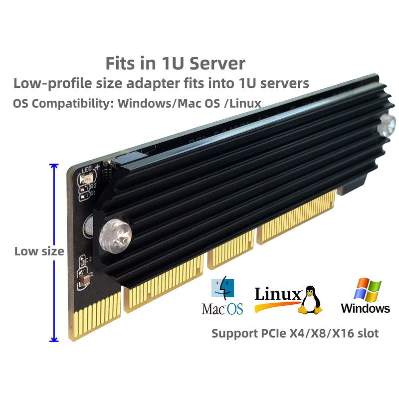 - NVMe PCIe Adapter Supports PCI-Express X4, X8, X16 slots, With aluminum heatsink.