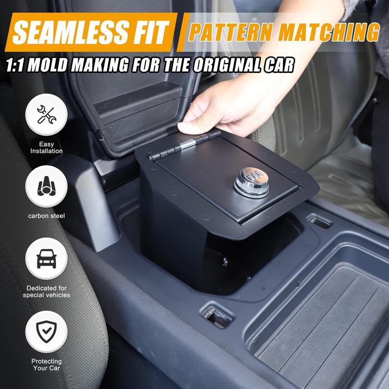 - 【About Installation】:The center console armrest safe is easy to install and use. Simply remove the pad under the armrest box, unscrew the bottom screws, place the product in place, and screw it in, no drilling required. Secures in the factory center console bolt holes. (Initial password has three zeros, go to the unlock position and reset the password)