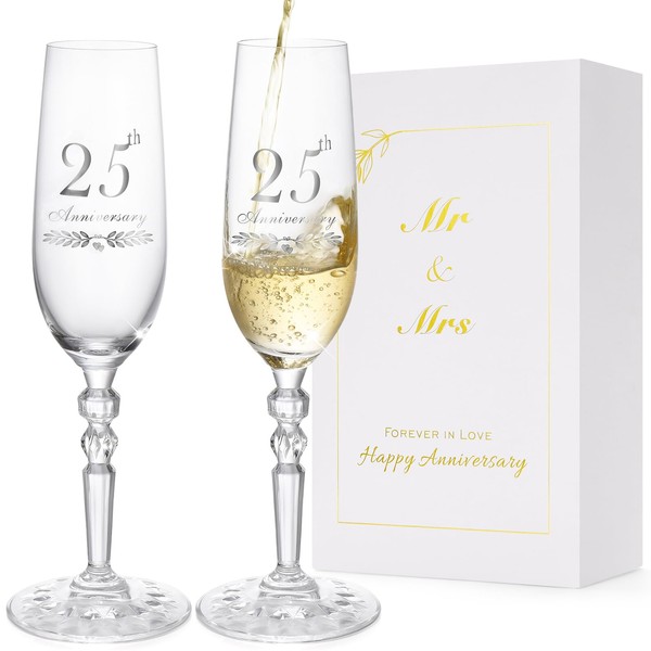 BEKESIN 25th Anniversary Decorations Gifts for Couple, Classical Style 25th Wedding Anniversary Champagne Flutes Glasses, Crystal Champagne Glasses Set of 2, Gifts for husband, wife, Couple