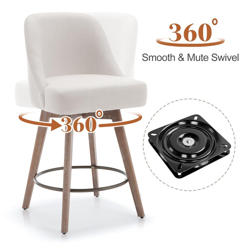 Bekrvio Counter Height Bar Stools, Modern Mid-Century Swivel Barstools with Backs and Wood Legs, Linen Fabric Upholstered Bar Chairs, 26" Seat Height Counter Stools for Kitchen Island, Off White