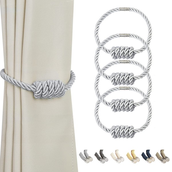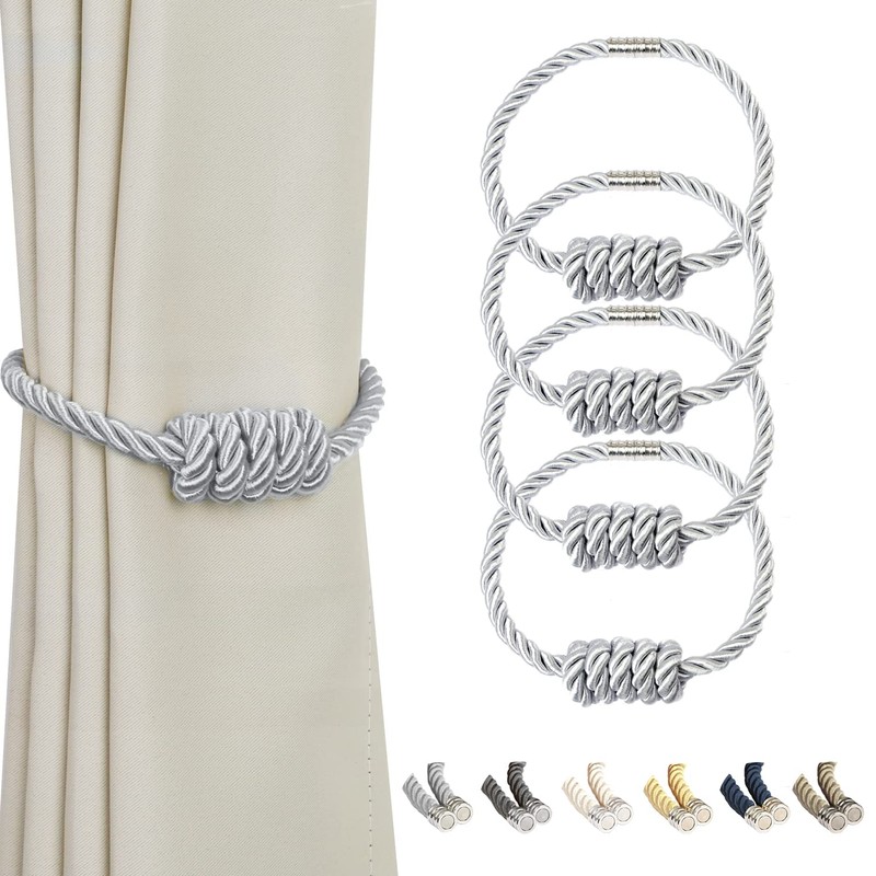 BEL AVENIR Magnetic Curtain Tiebacks, Decorative Drapery Holdbacks Modern Woven Tie-Backs with Exquisite Knot (Sliver, 4 Pack)