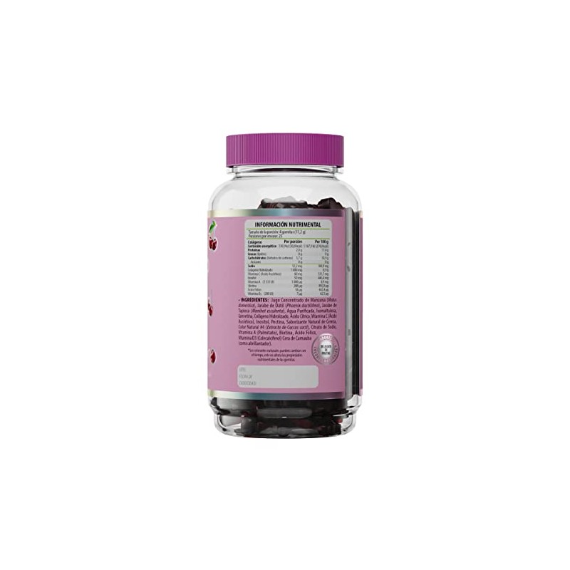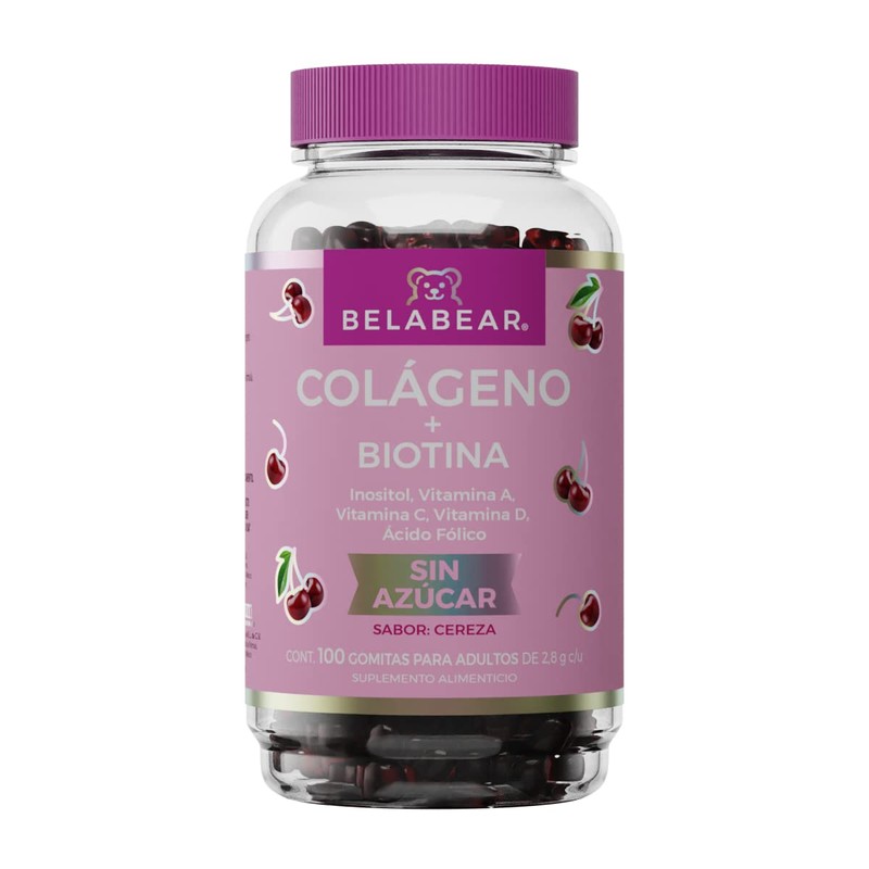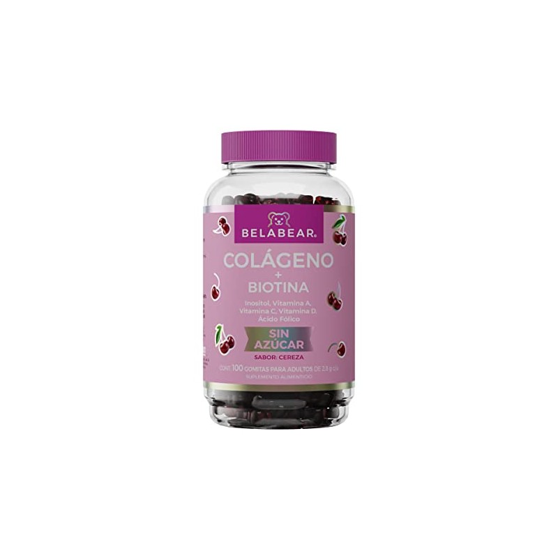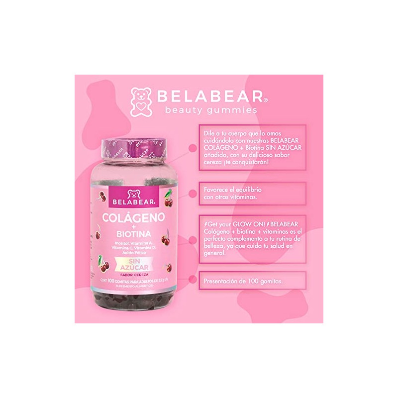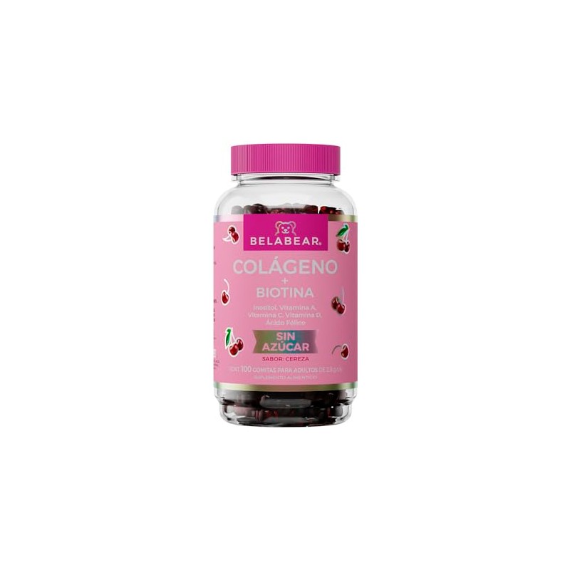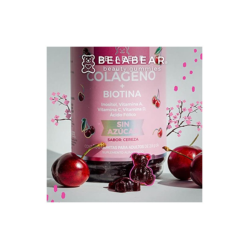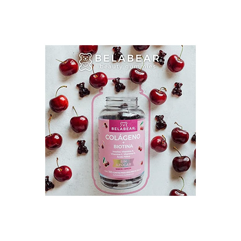 Belabear Gomitas Sin Azcar de Colgeno Biotina, Adicionadas con Inositol, Vitamina A, C Y D Y cido Flico, Sabor Cereza