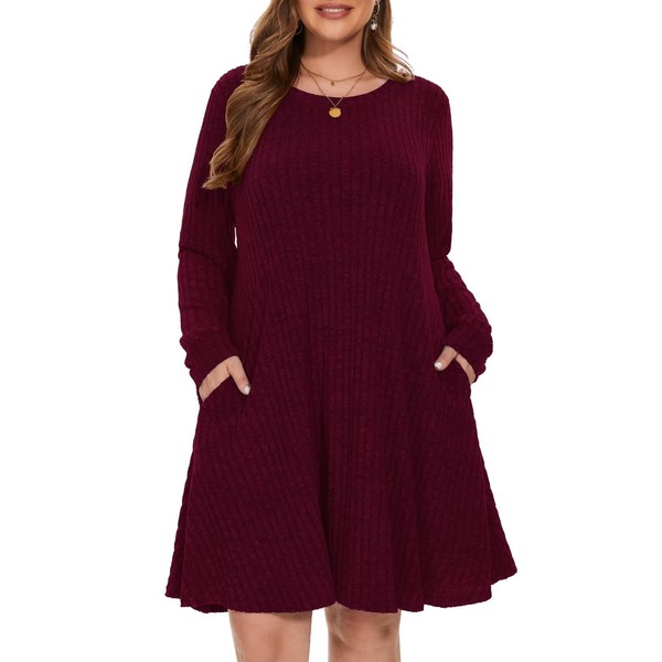 BELAROI Plus Size Sweater Dress Long Sleeve Dresses for Curvy Women Crew Neck Casual Fall Winter Tunic Dress Pockets (2X, Bordeaux Red)