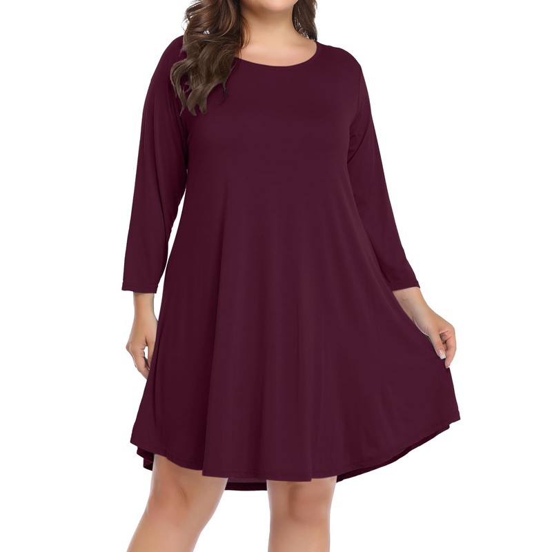 BELAROI Womens Plus Size Dresses Casual Fall Loose Flowy 3/4 Long Sleeve Scoop Neck Tshirt Swing Tunic Dress with Pockets (1X, Burgundy)