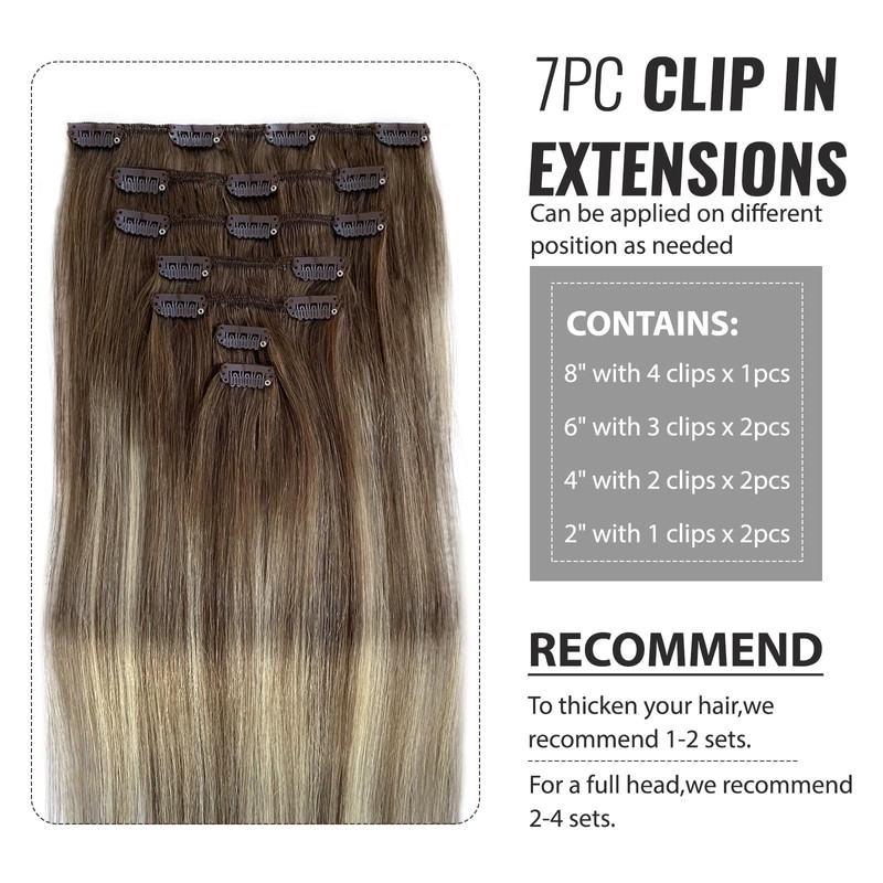 - 💖[Clip in Hair Extensions Specification] Our clip hair extensions is with 7 different width pieces,it suits your needs in different parts of the hair.16 clips per set,70g for hair with clips,to thicken your hair,we recommend 1-2 sets;for a full head,we recommend 2-4 sets.We put two more clips in the package for replacement.