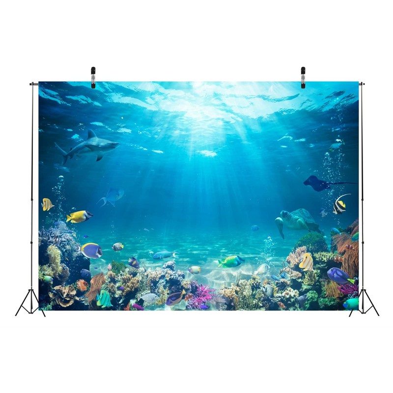 BELECO Underwater World Backdrop 7x5ftFabric Undersea Backdrop for Photography Under The Sea Tropical Fish Dolphin Turtle Coral Deep Sea Sunlight Seabed Background Undersea Party Photo Studio Prop