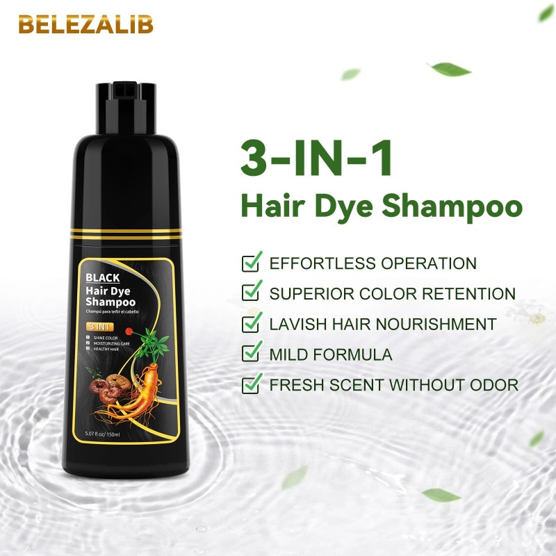 BELEZALIB Black Hair Dye Shampoo - Natural Nutrition for Gray Hair Coverage, 3 in 1 Shampoo for women, Semi Permanent Hair Color for Instant, Lasts 30 Days/Natural herbal Ingredients, 150 ML/5.07 OZ