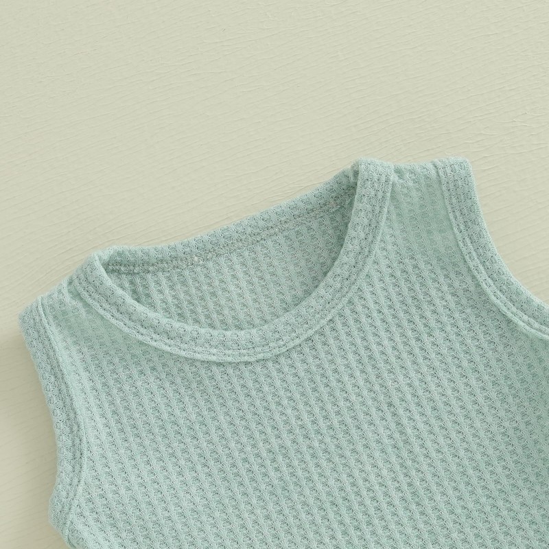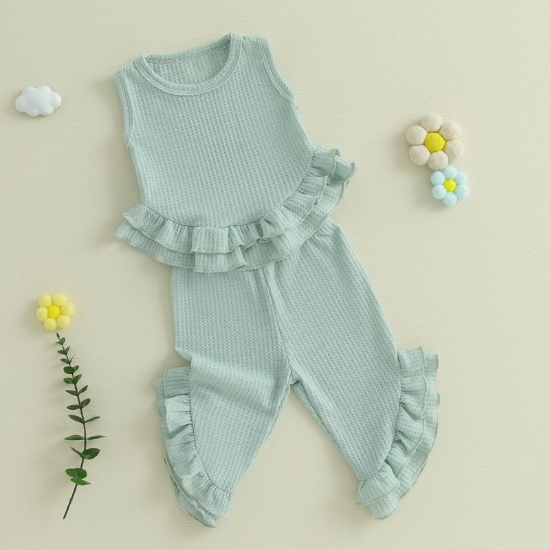 BeliBacca Baby Girls Summer Waffle Outfits Solid Color Sleeveless Crew Neck Ruffle Hem Tank Top Elastic Flare Pants Set 2pcs Toddler Kids Girl Clothes (Green, 18-24 Months)