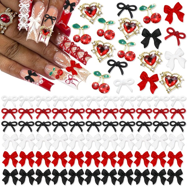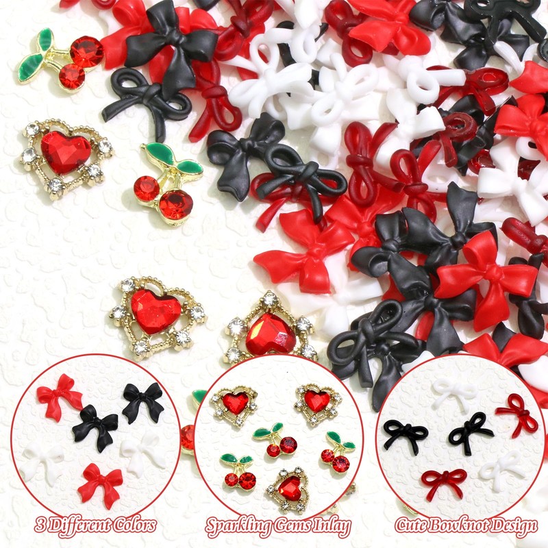 - What You Will Receive: You will receive a package of Assorted Nail Charms Set. Built-in various shapes and colors, can meets your daily needs. There are about 8 different styles (black/red/white colors of bows/cherry/heart, etc.), 130pcs in total. The cherry heart nail charms have shiny red gemstones set on them. These Cute Nail Charms are in variety of styles and large quantity, which can be used in a long time and help you design any kinds of nail art styles you want!
