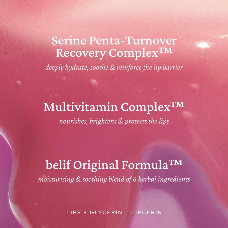 - * Clinically proven to increase skin barrier repair rate by 56.7% after use*, immediately increase skin firmness by 13.4% after use* (Clinical testing on 30 women for a period of 6 weeks) * Infused with Peptides - plump lips and enhance firmness Serine Penta-Turnover Recovery Complex- deeply hydrate, soothe & reinforce the lip barrier Multivitamin Complex - nourishes, brightens & protects the lips belif Original Formula - moisturising & soothing blend of 6 herbal ingredients