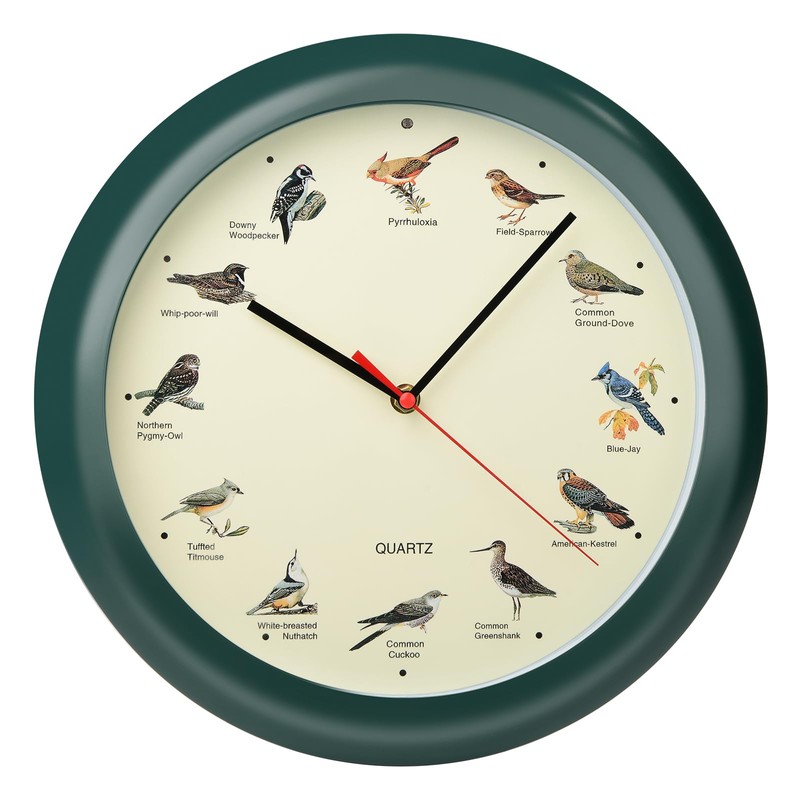 - Singing bird clock includes twelve beautiful songs at the top of each hour. Bird clock with great looking clock face and green frame which is perfect for your living room, bedroom, kitchen, classroom, office room or even outdoor garden decorative, it's singing sounds like just being in the forest.