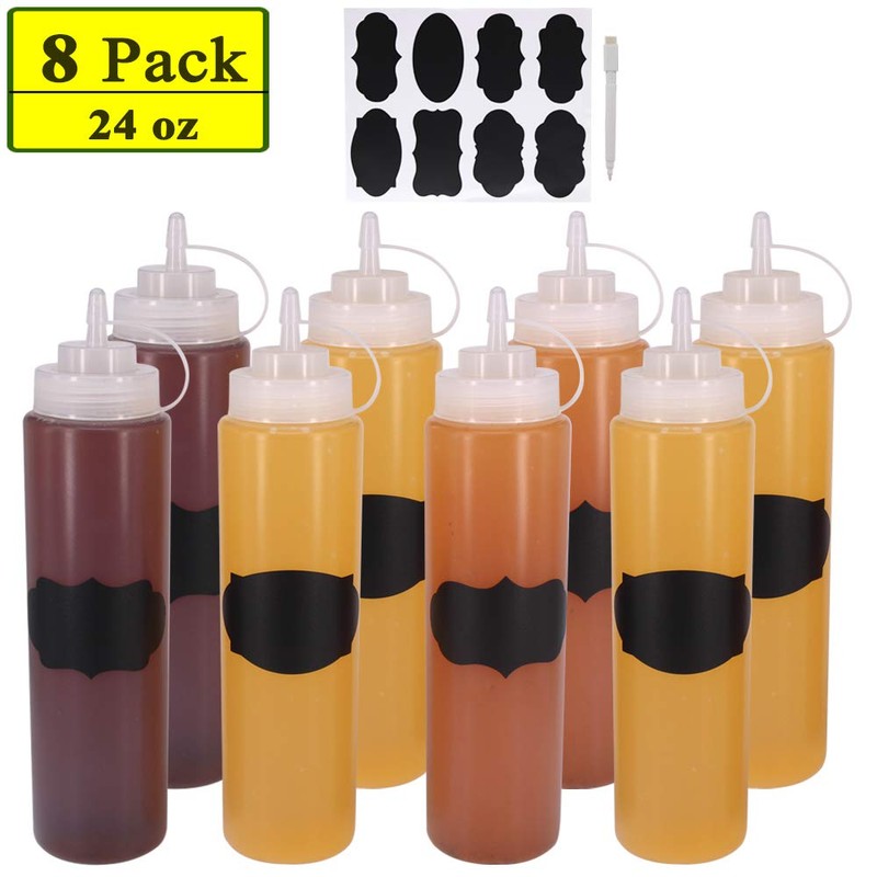 Belinlen 8 Pack 24 oz Plastic Squeeze Squirt Condiment Bottles with Twist On Cap Lids - Perfect for Condiments, Oil, Icing, Liquids–Set of 8 with extra 8 Chalk Labels and 1 Pen